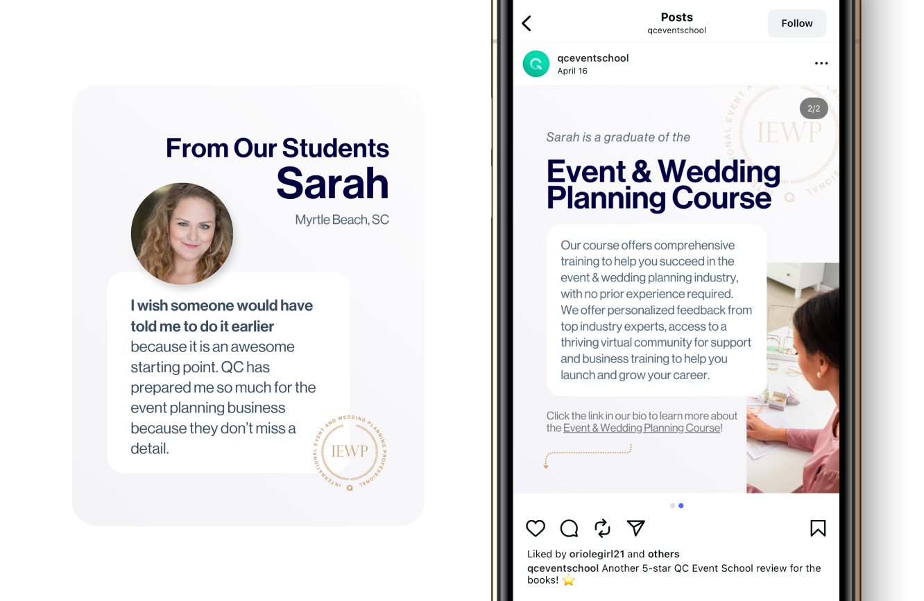 QC Event School uses Instagram to promote its event planning courses by showcasing it’s students’ visually stunning successful events, as well as behind-the-scenes glimpses of the event planning process with expert planners. With stories, reels and carousels, QC engages with its followers in a dynamic way, offering valuable tips, industry insights, and encouraging testimonials from alumni. Instagram provides a sense of community where potential students can see the real-world impact of their education in the event planning industry.