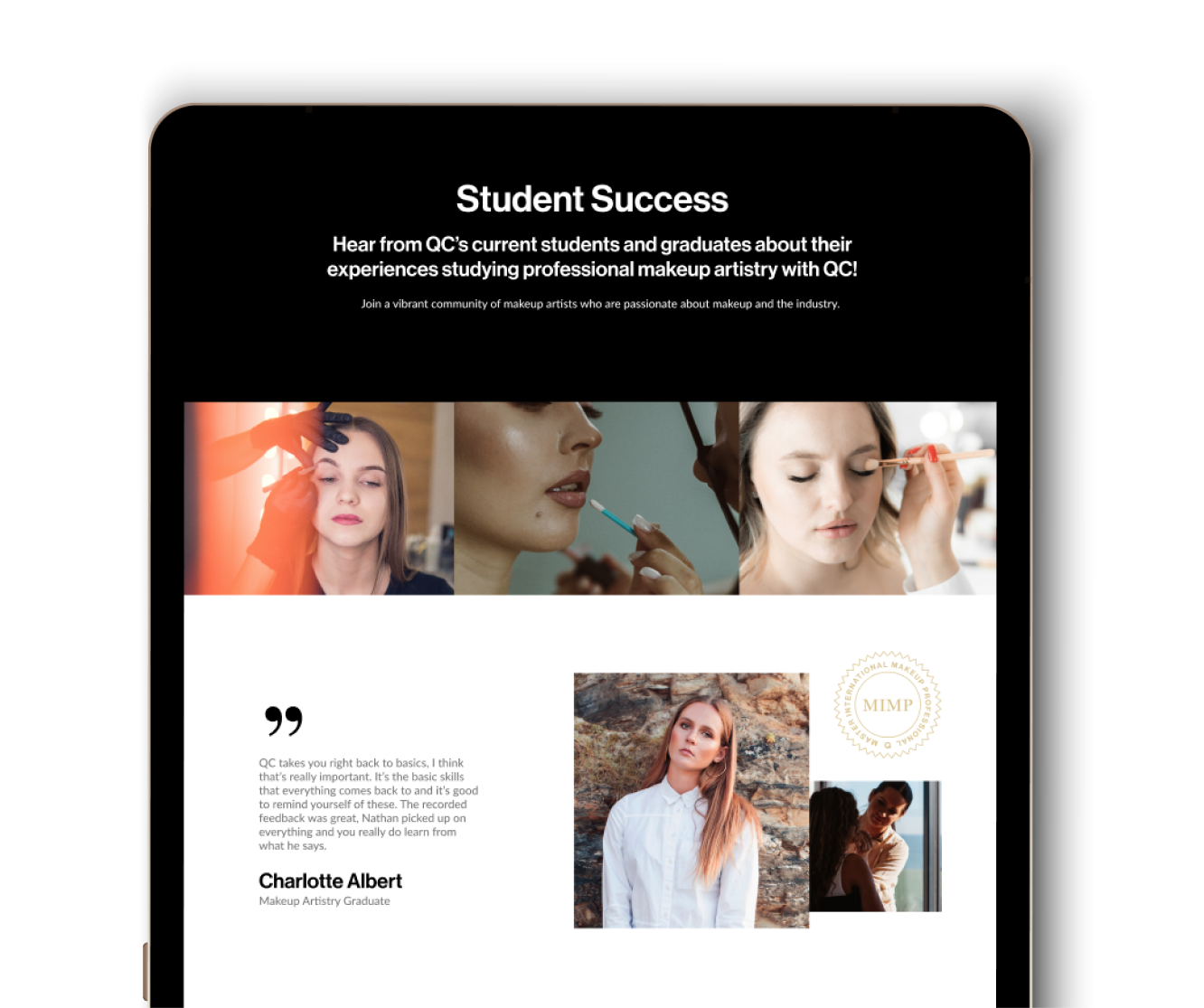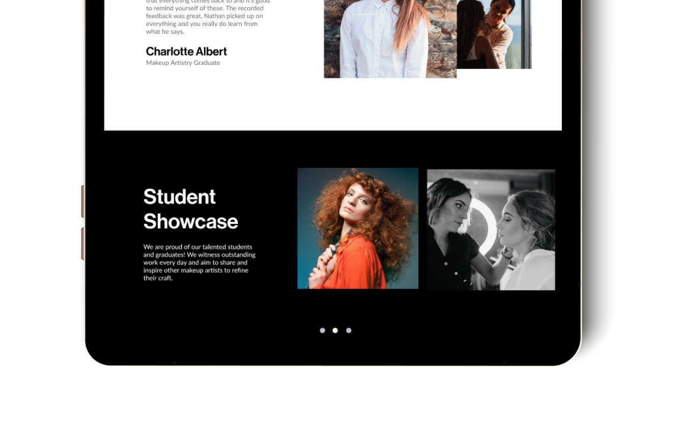 QC Makeup Academy explores several web design variations with one clear goal: to let the creativity of its thousands of students take center stage. The website’s layout was intentionally simple and understated, allowing the colourful, diverse student work to shine without distraction. QC serves as the steady foundation—a clean, cohesive framework that highlights the bold styles, vibrant imagery, and unique artistry of its virtual community.